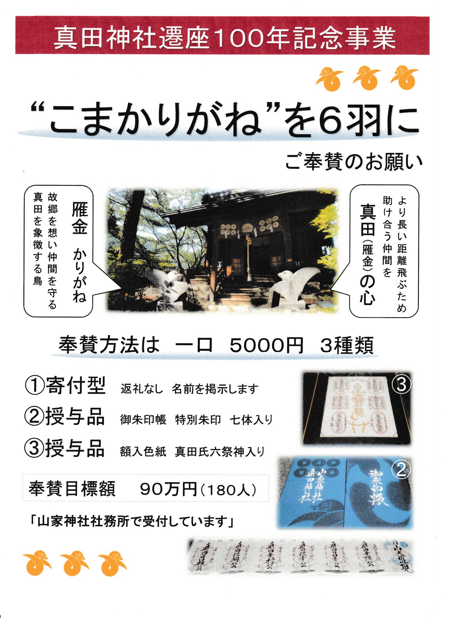 山家神社 真田神社 公式アカウント On Twitter こまかりがねを6羽に 奉賛受付 多くの反応をいただきありがとうございます 寄付型 授与品を受ける形2種 計3通りの方法があります 御朱印帳 は時間と気力が必要なので後日もしくは郵送の可能性も かりがねの