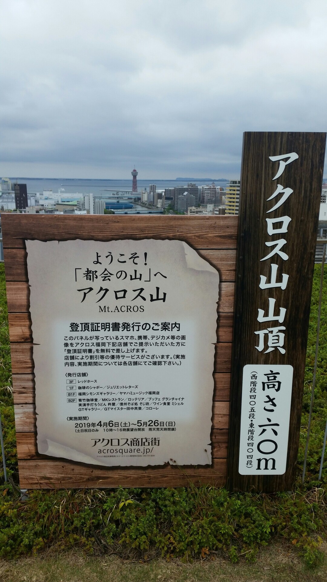 ランチでアクロス福岡に行った時にこんなポスターが貼ってありました 2019年4月6日5月26日土日祝日の10時16時の間アクロス 福岡の屋上展望台が解放されて登頂証明書が無料で発行されるようですね 皆さんもアクロス山に登ってみませんか アクロス福岡 屋上展望台 解放